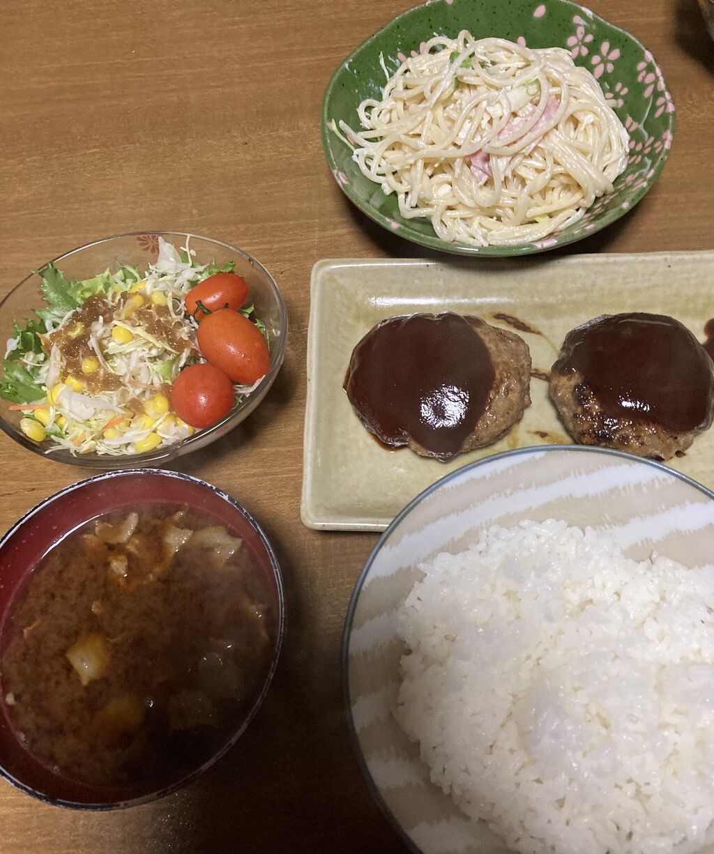 ハンバーグ、スパサラダ、豚汁、野菜サラダです。