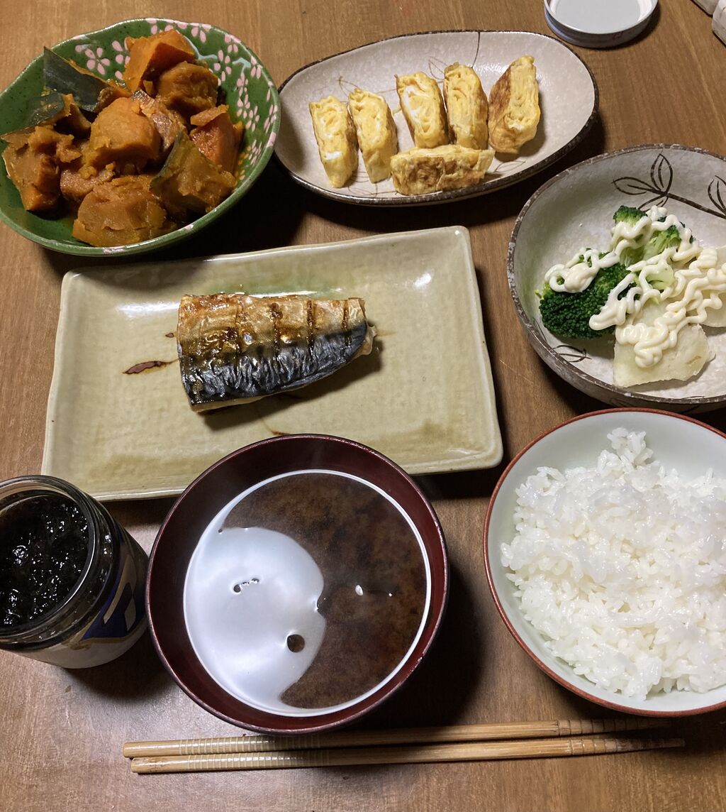 焼き塩サバ、だし巻きたまご、煮崩れたカボチャの