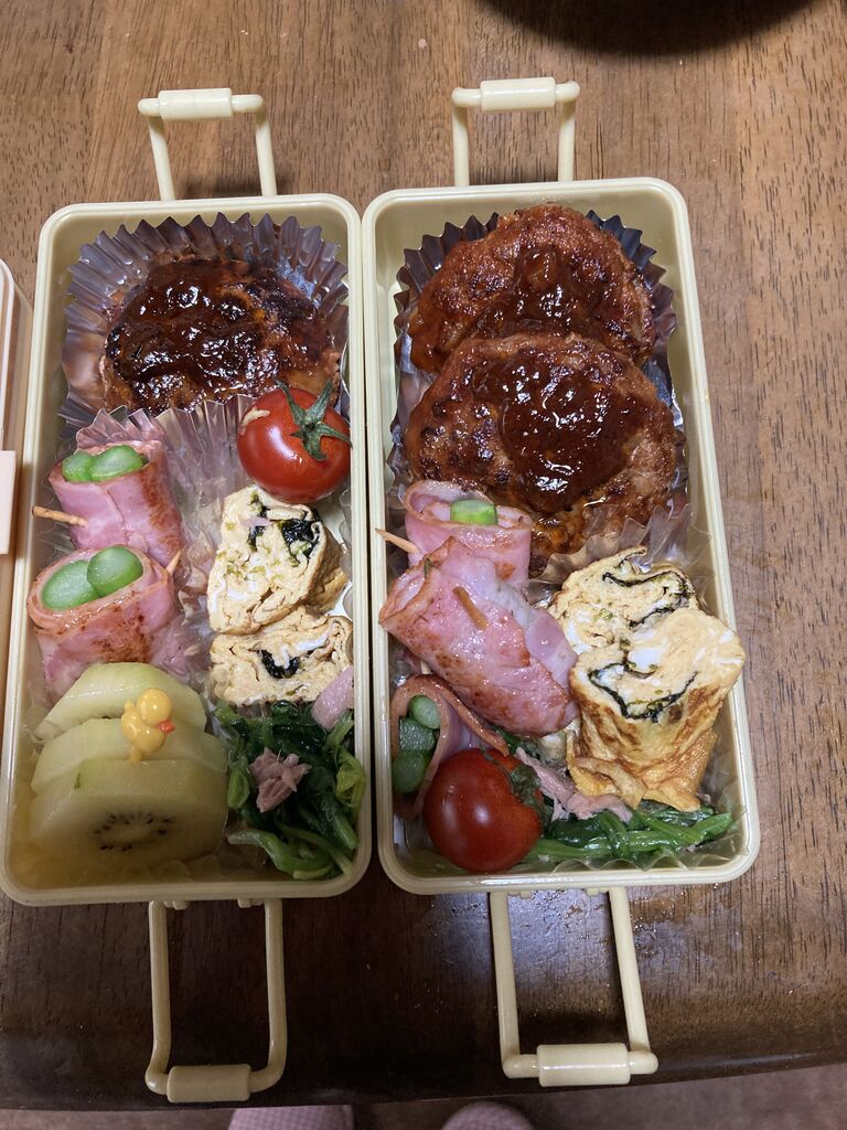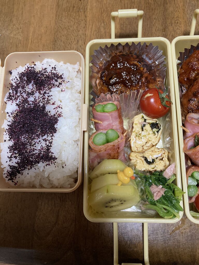 チーズハンバーグ、アスパラのベーコン巻、のり卵巻、ツナとほうれん草の和え物、キウイです。
